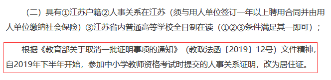 “自2019年下半年开始,申请中小学、幼儿园教师资格考试和认定时提交的工作单位或者人事关系证明,改为居住证。”