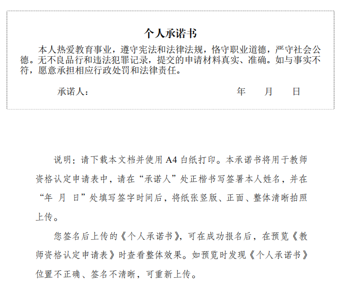 说明:请下载本文档并使用 A4 白纸打印。本承诺书将用于教师资格认定申请表中,请在“承诺人”处正楷书写签署本人姓名,并在“年 月 日”处填写签字时间后,将纸张竖版、正面、整体清晰拍照上传(在上传个人承诺书时,只需截图个人承诺书部分即可。)。您签名后上传的《个人承诺书》,可在成功报名后,在预览《教师格认定申请表》时查看整体效果。如预览时发现《个人承诺书》位置不正确、签名不清晰,可重新上传。